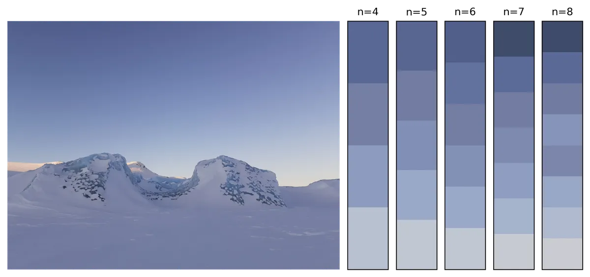 because sklearn.clusters.KMeans is a quick and easy[2] method of identifying groups (clusters) within n-dimensional datasets, that’s what i used. before tackling the (slightly) harder task of finding average clusters within different regions of an image (as above), i first identified clusters from a single image (fig 3). and by choosing an image that isn’t too colourful, the cluster centroids end up making a reasonably nice sequential[3] colour scheme. after that, it was straightforward enough to drop in any other image i wanted (fig 4 & fig 5)