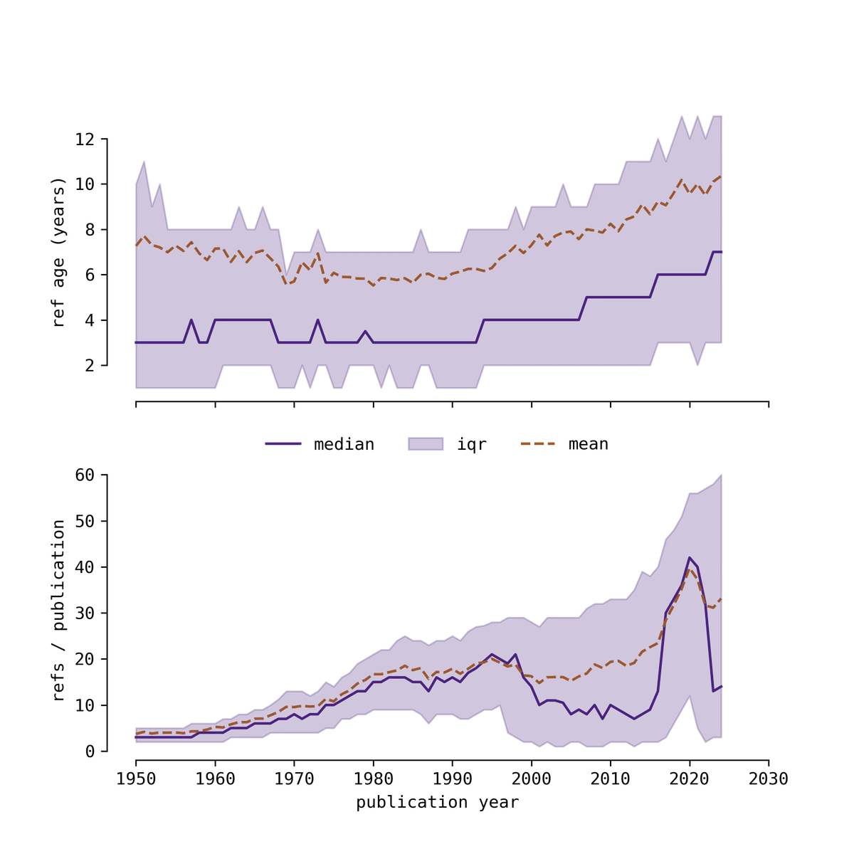 As for the tail, in the 1950s 99% of references cited were ~55 years old, or younger. This shrank to a minimum of ~35 years in 1980, and since 2010 it has been steady at ~55 years. Using the age of a reference (pub_year - ref_year), a quick scipy.stats.mannwhiteneyu() suggests that the 1950 distribution is ✨significantly✨ different from the 2020 distribution (Fig 2). But I reckon you'd eye-balled that already.